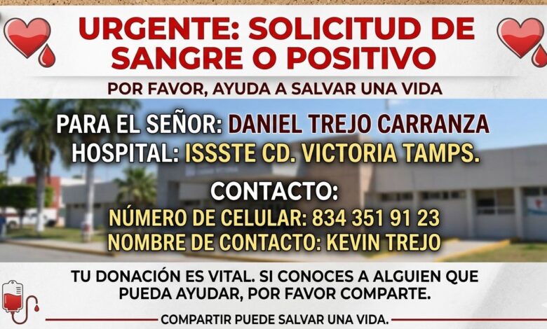 Mientras tanto, la familia continúa en espera de donadores para el señor Daniel Trejo Carranza, quien requiere sangre tipo O positivo.