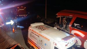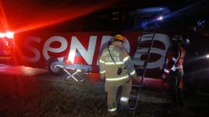 Linares, Nuevo León.– La madrugada de este viernes se registró un accidente vial en el kilómetro 136 de la Carretera Victoria–Monterrey, a la altura del ejido La Soledad, donde un autobús del grupo Senda, procedente de Tampico, fue impactado por un tráiler que se dio a la fuga.