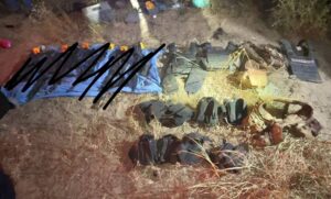 Asimismo, fue asegurada una camioneta tipo pick up con reporte de robo en el extranjero, una cubeta con 40 poncha llantas, cuatro chalecos tácticos, cuatro equipos de radiocomunicación, 39 cargadores y seis armas largas.