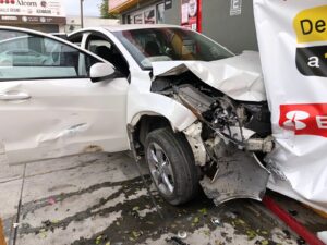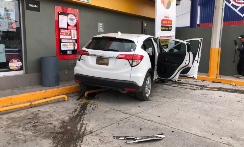 Tras el choque, la camioneta quedó fuera de control y terminó proyectándose contra una tienda de conveniencia Oxxo, donde sufrió severos daños en la parte frontal.