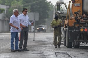 “El plan de bacheo va conforme a lo planeado en las cuatro rutas prioritarias para recuperar el 70 por ciento del asfalto dañado” señaló Gattás Báez en el recorrido que realizó junto al secretario de Obras Públicas y contratista de la empresa responsable.