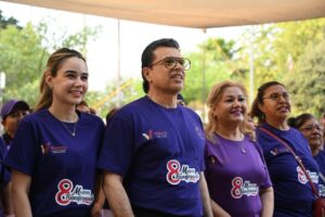 A la ejercitación aeróbica se sumaron la secretaria de Bienestar Lorena Zapata; Herlinda Molina, delegada estatal de Atención a la Violencia Familiar y de Género; Ana Pérez Paz, por el Instituto de la Defensoría Pública, integrantes del Cabildo y empleadas del Ayuntamiento.