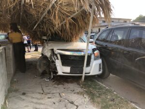 Tras el choque inicial, ambas unidades se proyectaron sin control contra dos vehículos que estaban estacionados y terminaron por derribar parte de la estructura del local, incluyendo el techo.