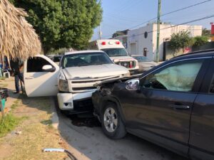 Ciudad Victoria, Tamaulipas.- Una carambola que involucró cuatro vehículos y dejó tres personas lesionadas se registró la tarde de este jueves en el cruce de la calle Juárez con el 28. En el percance también resultó afectado un negocio de venta de aguas frescas.