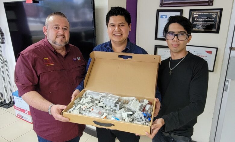 Ciudad Victoria, Tamaulipas, abril 15.– Jesús Abraham y Gregory Javier Martínez Aguilar, egresados de la carrera de Ingeniería Mecatrónica de la Universidad Politécnica de Victoria (UPV), realizaron la donación de material electroneumático y neumático para fortalecer las prácticas académicas de las y los estudiantes de diversas carreras.
