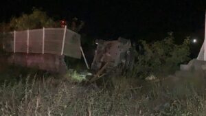 El vehículo terminó volcado sobre su costado dentro de un predio enmontado, quedando destrozado.