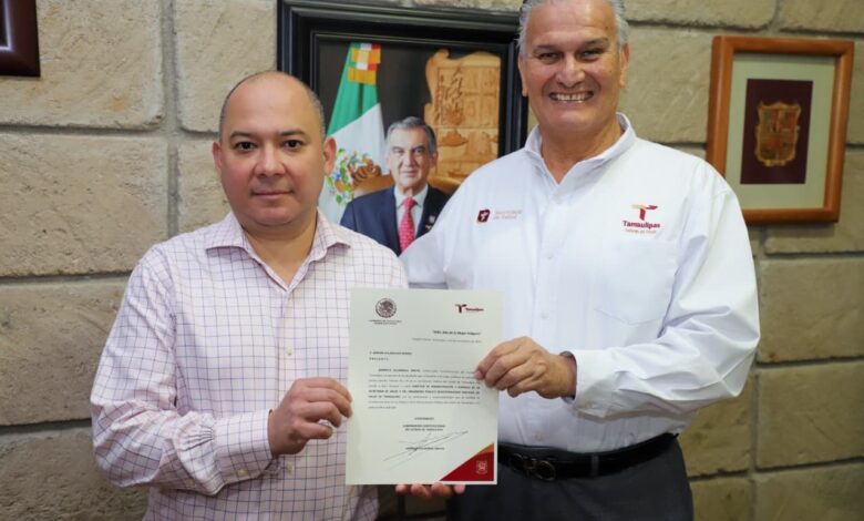 Ciudad Victoria, Tamaulipas, noviembre 04.- Con la entrada en vigor y después de las reformas a la nueva estructura orgánica, por instrucción del gobernador Américo Villarreal Anaya, el titular de la Secretaría de Salud de Tamaulipas, Vicente Joel Hernández Navarro, hizo entrega de los nombramientos a los nuevos titulares de la dependencia estatal.