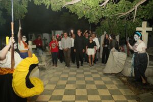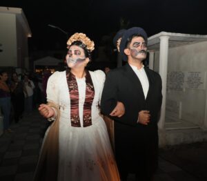 Ahí en el panteón de Árbol Grande se escenificó una obra teatral, donde también estuvieron presentes síndicos y regidores, que se unen a esta Luz y Tradición, que congrega a cientos de familias durante estos días para visitar a sus deudos. Las celebraciones continuarán este domingo a partir de las 17:00 horas en el parque Bicentenario, muestra de altares, grupos de danza, el concierto “El son del Catrín”, participación de calaveritas literarias.