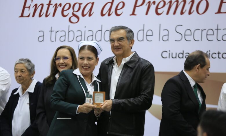 Acompañado por Marggid Rodríguez Avendaño, coordinador de IMSS-Bienestar en Tamaulipas y dirigentes sindicales, el jefe del Ejecutivo entregó 37 premios de antigüedad, de un total de 1,400 a personal de salud, destacando por 60 años de servicio, Almarcelia Cárdenas Guardado, enfermera general titulada “B”, del Distrito de Salud para el Bienestar I, en Ciudad Victoria.