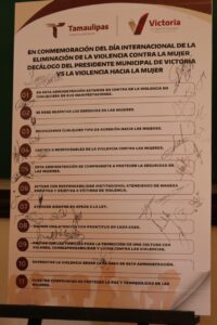 Ciudad Victoria, noviembre 25. – Con la presencia de la presidenta del Sistema DIF, Lucy de Gattás, el alcalde de Victoria Eduardo Gattás Báez firmó, junto a integrantes del Gabinete Municipal, el decálogo contra la violencia hacia la mujer para dar paso firme hacia un futuro libre de violencia de género.
