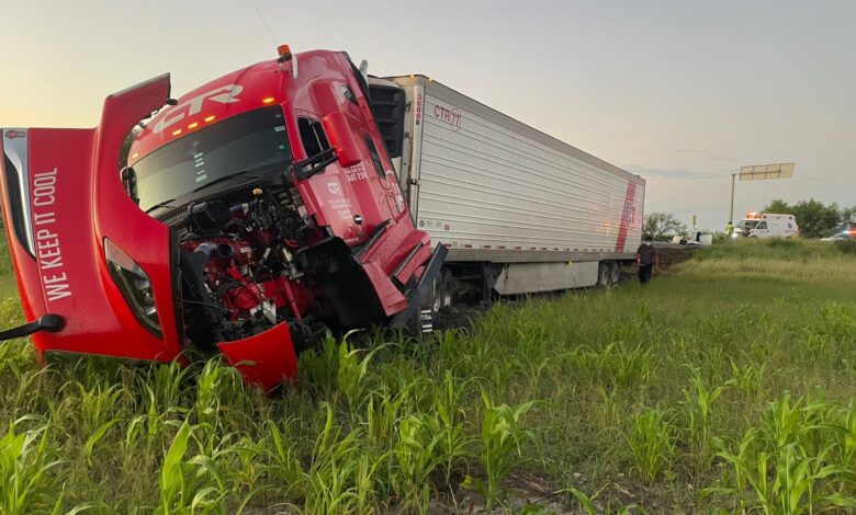 El percance involucró a una camioneta Pick-Up Ford cabina y media, la cual transportaba varias lavadoras en la parte trasera, y un tráiler de la empresa CTR, cuyo tractocamión de color rojo terminó fuera de la vía, dentro de una parcela.