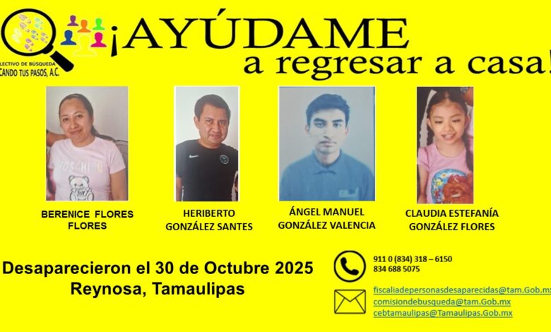 Reynosa, Tamaulipas. – Autoridades estatales localizaron sin vida a los integrantes de una familia reportada como desaparecida en la colonia Hacienda Las Fuentes Sector 4 de Reynosa. Los restos fueron hallados en distintos puntos de la ciudad, y de manera preliminar se confirmó la detención de un hombre y una mujer presuntamente implicados en los hechos.