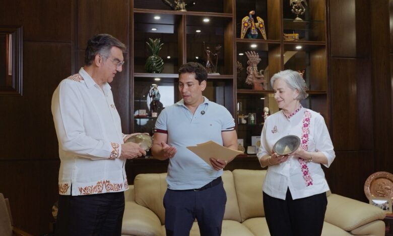 Junto con la doctora María de Villarreal, presidenta del DIF Tamaulipas, el gobernador agradeció las gestiones realizadas ante el Vaticano para lograr la bendición papal de ambas piezas que formarán parte de la escultura de más de 32 metros que se entregará el próximo 12 de diciembre.