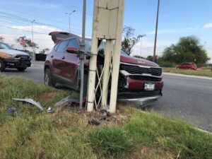 Ciudad Victoria, Tamaulipas.- Una camioneta Kia en la que viajaba una familia integrada por una mujer, una menor de edad, un joven y un hombre adulto, se impactó contra un poste con cables de alta tensión luego de que el conductor presuntamente perdiera el control tras dar un volantazo.