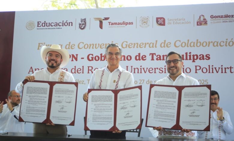 González, Tamaulipas., septiembre 27 – El gobernador Américo Villarreal Anaya firmó el convenio de colaboración con el Instituto Politécnico Nacional e inauguró el Recinto Universitario Polivirtual, una nueva plataforma académica con la calidad y la excelencia educativa que distingue a esta prestigiada institución y que, por primera vez, se pone en marcha en todo el país.