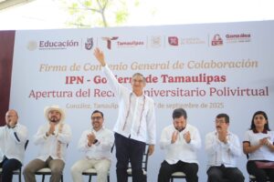 González, Tamaulipas., septiembre 27 – El gobernador Américo Villarreal Anaya firmó el convenio de colaboración con el Instituto Politécnico Nacional e inauguró el Recinto Universitario Polivirtual, una nueva plataforma académica con la calidad y la excelencia educativa que distingue a esta prestigiada institución y que, por primera vez, se pone en marcha en todo el país.