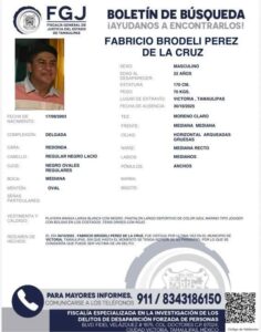 La Fiscalía General de Justicia del Estado (FGJE) emitió fichas de búsqueda para dar con el paradero de los desaparecidos, identificados como Fabricio Pérez de la Cruz, de 22 años; Juan Carlos Rodríguez Hernández, de 38; y Luis Alberto Castillo Sánchez, de 27.
